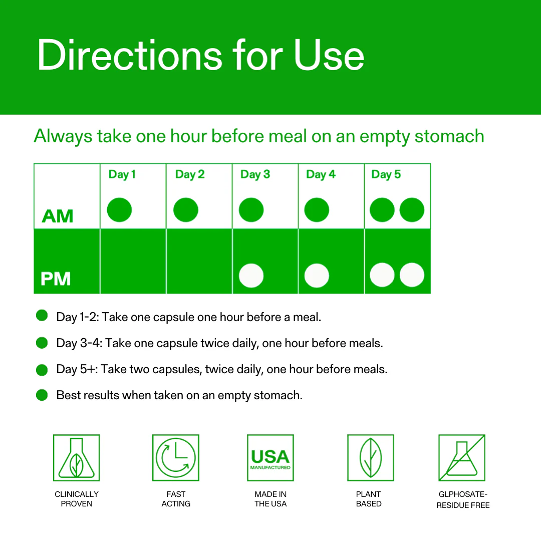 Day 5+: Take two capsules twice daily, one hour before meals.