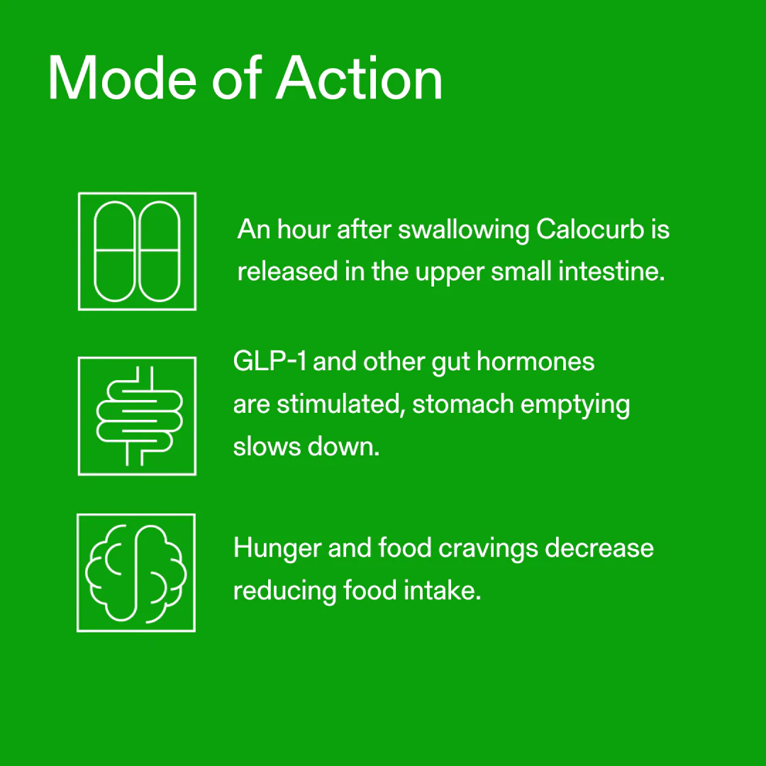 - The Result: Calocurb stimulates the release of gut hormones (GLP-1 and CCK) by 600% above baseline, sending a natural ‘fullness’ signal to the brain which makes you feel full faster.